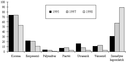 Míg 1995-ben és 1997-ben a feketemunkások toborzásának kiemelkedően leggyakoribb helye a kocsma volt, 1998-ban a személyes kapcsolatok emberpiacokat elkerülő formája3 lett a domináns (1. ábra).