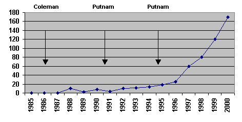 Látható, hogy a társadalmi tőkére gyakorlatilag nem történt hivatkozás a Coleman cikk (1988) előtt, illetve, hogy Putnam olasz, de különösen amerikai társadalmi tőkéről szóló művei (1993 és 1995) hatására megszaporodott a társadalmi tőke fogalom használata.