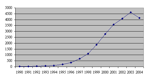 2. ábra: A társadalmi tőke (social capital) fogalom évenkénti előfordulása a Google Scholar keresőgép segítségével 1990 és 2004 között (esetszám)