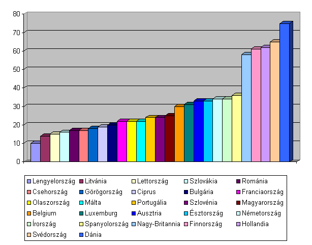 * Azok aránya, akik szerint az emberekben meg lehet bízni az EU huszonöt országában, valamint Romániában és Bulgáriában (Forrás: Eurobarometer 2004, Wallace, 2005).