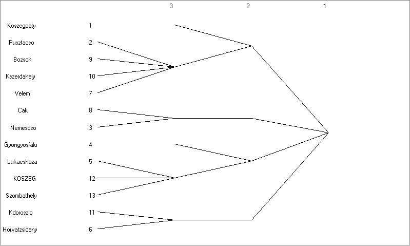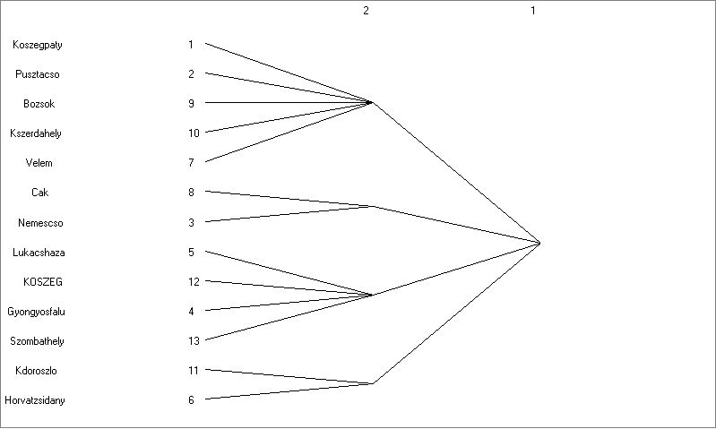Hogy a hat vagy a négy blokkból álló felosztást választjuk-e, az ugyanúgy a kutató szabadsága, mint például a hierarchikus klaszterelemzésnél a csoportok számáról való döntés. Jelen esetben ténylegesen nincs értelme blokkokat készíteni, hiszen felesleges a 13 szereplős mátrixot 6 vagy négy elemesre csökkenteni. A példa kedvéért maradjunk a 6 blokkos felosztásnál. Itt világosan elkülönülnek az izolált pontok (2 db) és a nagy központiságú szereplők (Kőszeg, Szombathely, Lukácsháza). A CONCOR elemzés a következő adatokat adja ki: