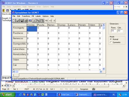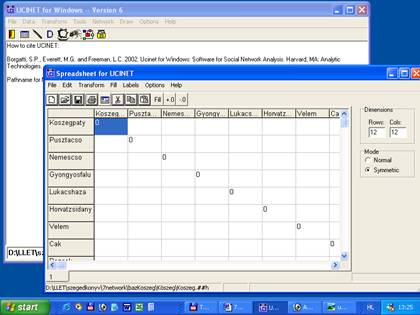 Kattintsunk az ikonok közül a táblázatra. A megjelenő új ablak a Ucinet adatbázis kezelő. A táblázat szélére kattintva a nevet, a közepébe az értéket írhatjuk. A szoftver nem ismeri a magyar hosszú ő és ű betűket, az egységes írásmód végett a nevek lehetőleg csak az angol ABC karaktereit tartalmazzák. Kezdésképpen, amíg nincsenek adataink, a főátlót írjuk tele 0-val. A főátlót képező 0-kat azért érdemes beírni az elején a keretfájlba, mert később, adatbevitelkor (különösen nagyobb táblázatoknál) segít megtalálni, hogy hol is tartunk. Példaként egy régebbi munkánk, a kőszegi kistérség településközi kapcsolatainak adatait használom fel[1].