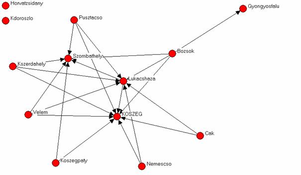 Az ábrára rátekintve látható, hogy a kistérség munkahely szempontból erősen centralizált. A központi szereplők Kőszeg, kisebb mértékben Lukácsháza, illetve Szombathely. Szombathely természetesen nem a kistérség része, azért szerepel az adatbázisban, mert jelentős elszívó hatást gyakorol a helyi munkaerőpiacra[2]. Az ábráról az is leolvasható, hogy mely településekről járnak az emberek Kőszegre dolgozni, melyekről Kőszegre és Lukácsházára egyaránt, stb. A képről azért olvasható le ez a sok információ, mert a NetDraw olyan szoftver, amely rajzolás közben elemez is: ismétlődő műveletek (iterációk) sorát hajtja végre, hogy végül az egymáshoz hasonló helyzetű szereplők kerüljenek egymás mellé. Alapértelmezésben a központi szereplők kerülnek középre, körülöttük helyezkednek el a hozzájuk kapcsolódó szereplők, az ugyanahhoz a taghoz kapcsolódó szereplők egymás mellé, az elszigeteltek pedig a bal felső sarokba kerülnek. Ha játszunk az ikonsoron, akkor átrendezhetjük a grafikai képet más elvek szerint, például úgy, hogy körben legyenek a szereplők, vagy sokdimenziós skálázás szerint csoportokba osztva. Kézzel is belekontárkodhatunk a rajzba, például egérrel megfogva a pontokat arrébb húzhatjuk, ilyenkor természetesen a kapcsolati szálak is megnyúlnak. Ha a kép olyan, amilyet szeretnénk, elmenthetjük kép fájlként (Save diagram as). A grafikai kép alapján kialakuló sejtésünket természetesen matematikai-statisztikai elemző módszerekkel is igazolnunk kell. A példában szereplő kis elemszám esetén „ránézéses módszerrel” is kialakulhatnak sejtéseink, de nagyobb elemszám, több száz vagy több ezer kapcsolat esetén a grafikai kép átláthatatlan, ezért még a sejtéseket is mátrix alapú elemzésekre kell alapozni.
