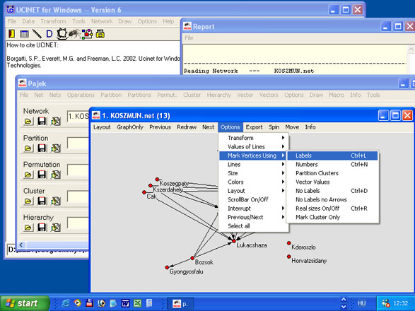 A kapcsolatháló grafikai képének felvázolása sokszor a kutató számára is adhat ötleteket, érdemes az elemzést ezzel kezdeni. Először is zárjuk be az elkészített adatmátrixokat, majd a Ucinet menü ikonjai közül válasszuk ki az utolsó előtti ikont (NetDraw; lásd 1. ábra.). Erre kattintva egy újabb ablak jelenik meg. Itt válasszuk a File – Open – Ucinet Dataset – Network menüt, (vagy kattintsunk egyet a nyitott fájl ikonra), ekkor egy újabb kisablak jelenik meg. Válasszuk ki az egyik adatbázisunkat, és nyomjunk egy Open-t. A Netdraw válaszul megrajzolja a kapcsolatháló képét.